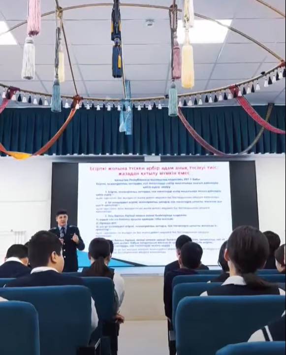 - Жасөспірімдер – қоғамның болашағы. Сондықтан олардың өмірге деген көзқарасын дұрыс қалыптастыру, қауіп-қатерді ерте жастан ажырата білуіне көмектесу аса маңызды. Осындай кездесулер арқылы біз оқушыларды заңға қайшы әрекеттерден сақтандырып, өз денсаулығы мен болашағына жауапкершілікпен қарауға шақырамыз, – деді полиция майоры Айбол Ідірісов.